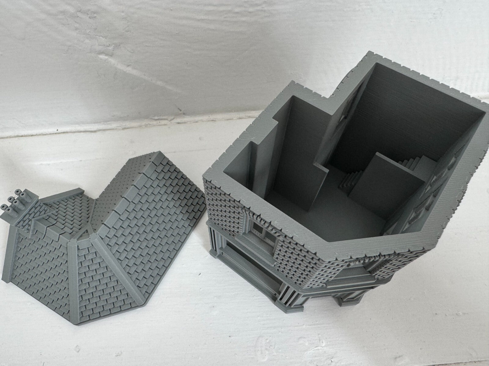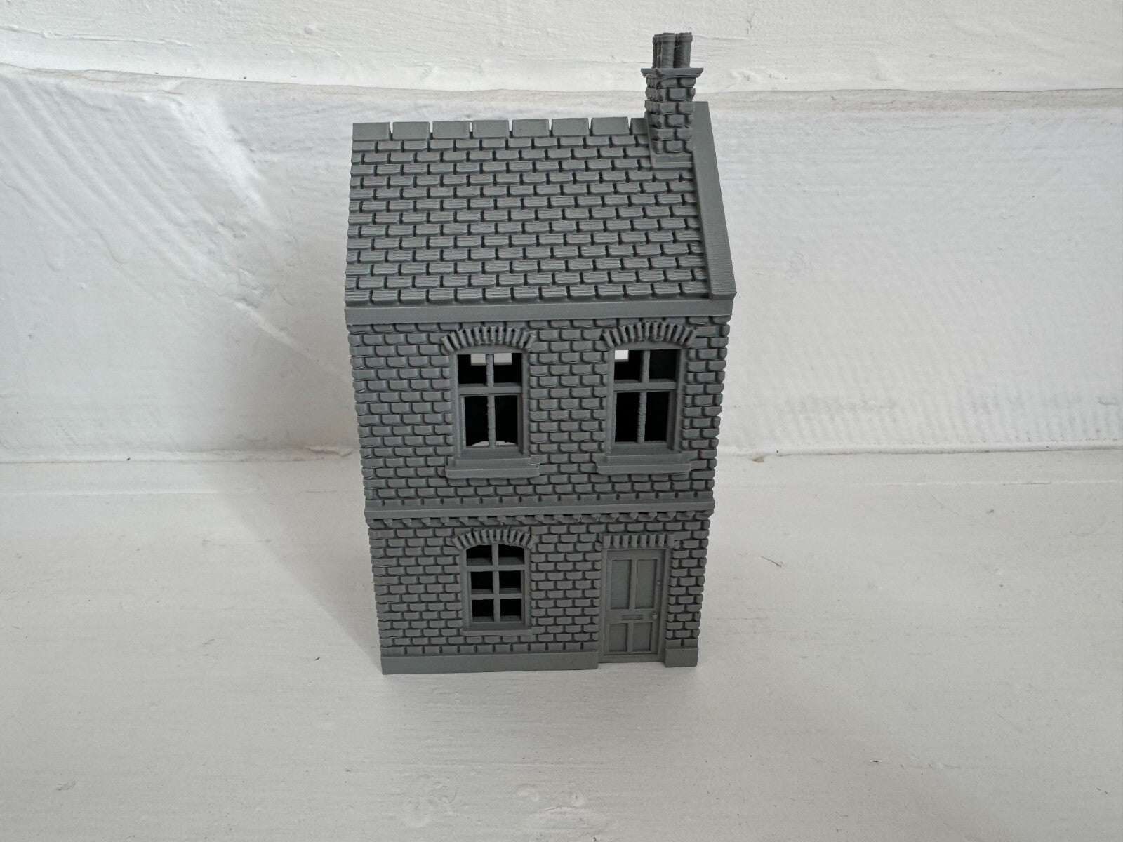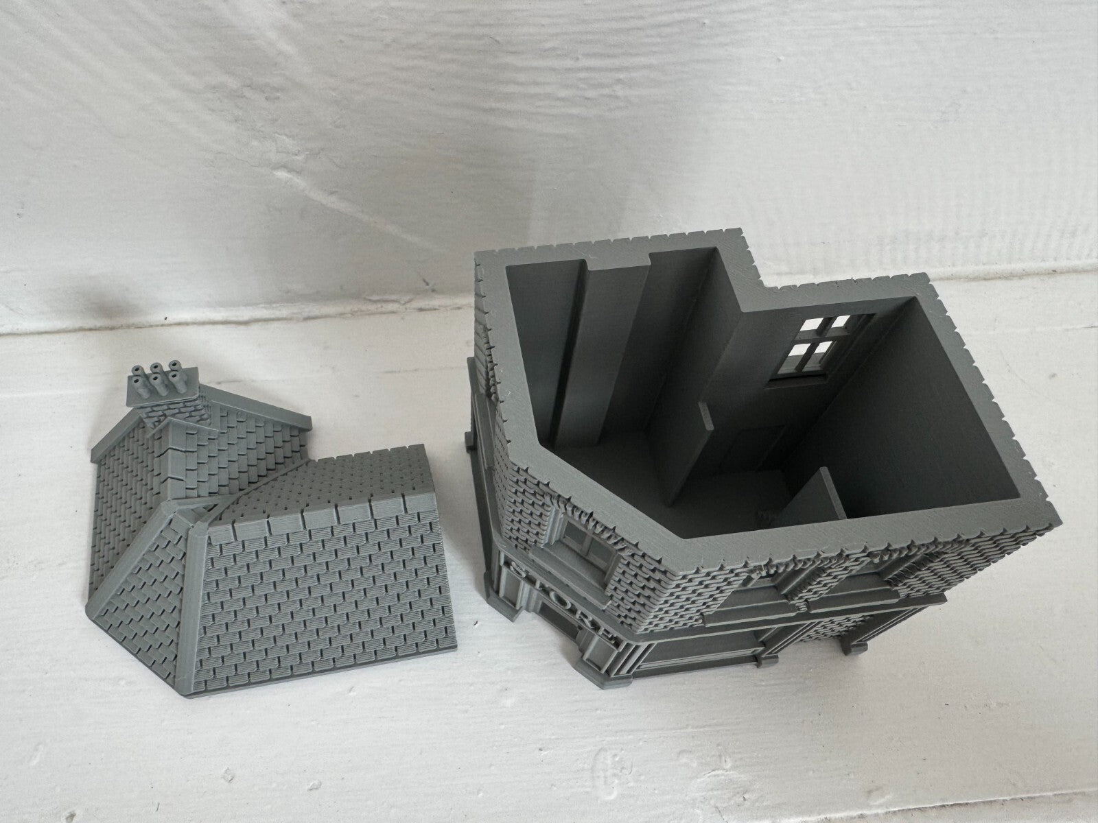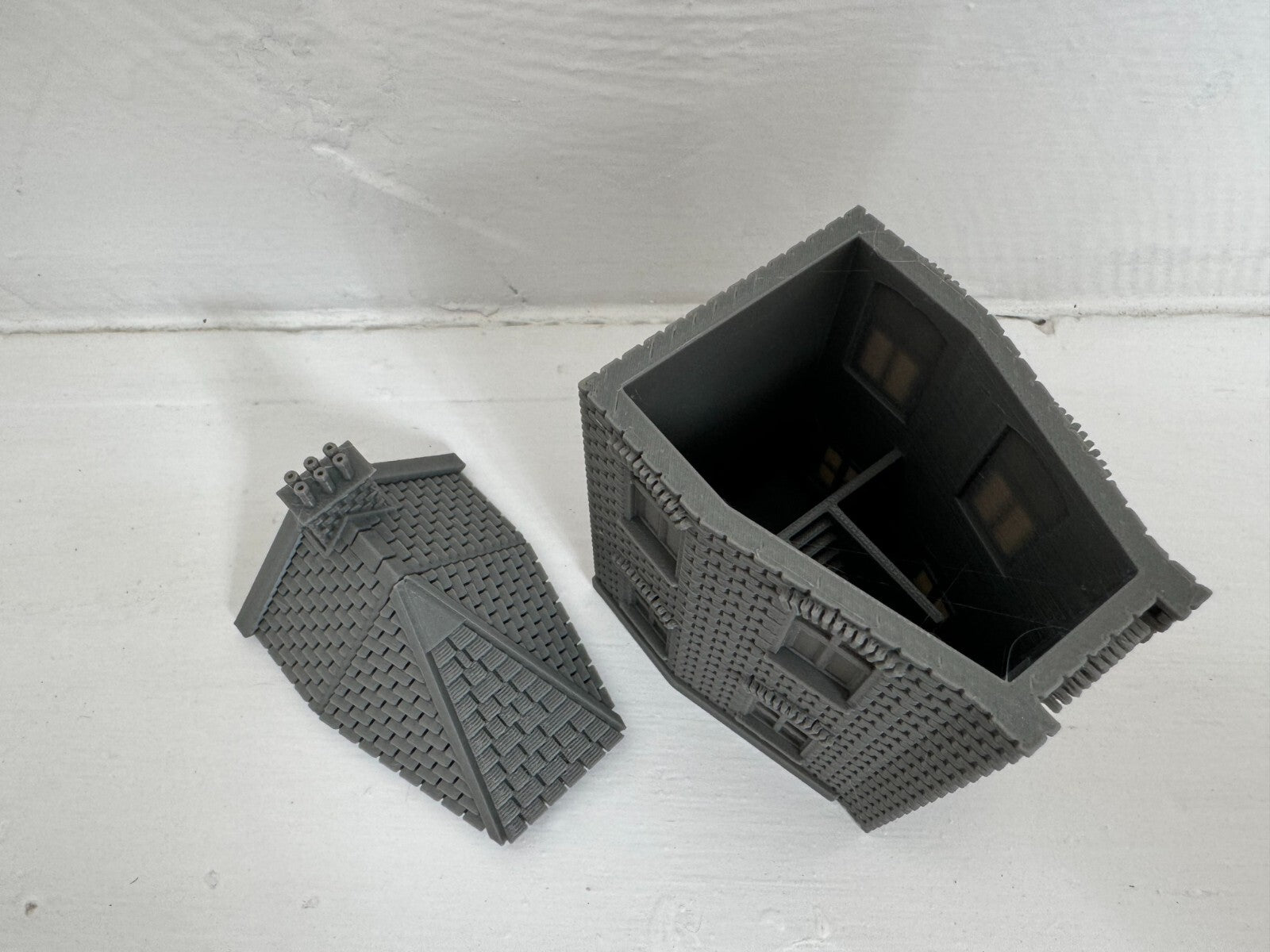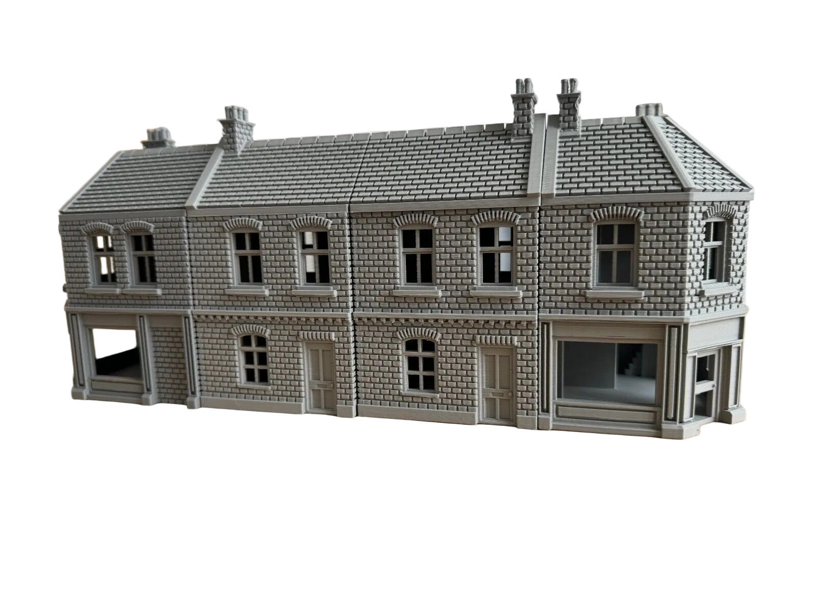 This detailed OO Gauge (20mm scale) street set offers a foundation for creating dynamic and atmospheric tabletop gaming environments. Each building is thoughtfully designed in two pieces, with integrated stairs leading to a second floor, perfect for imaginative gameplay. While the interiors are compact, they provide ample opportunity for customization with your own floors, furniture, and details.