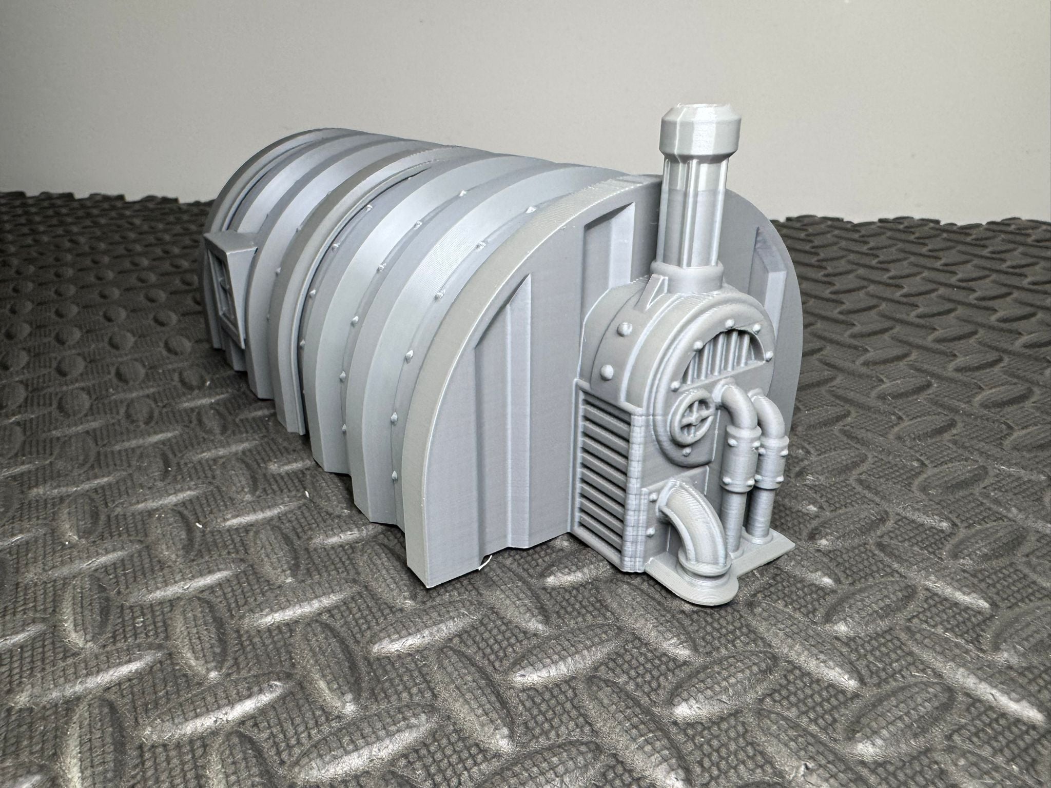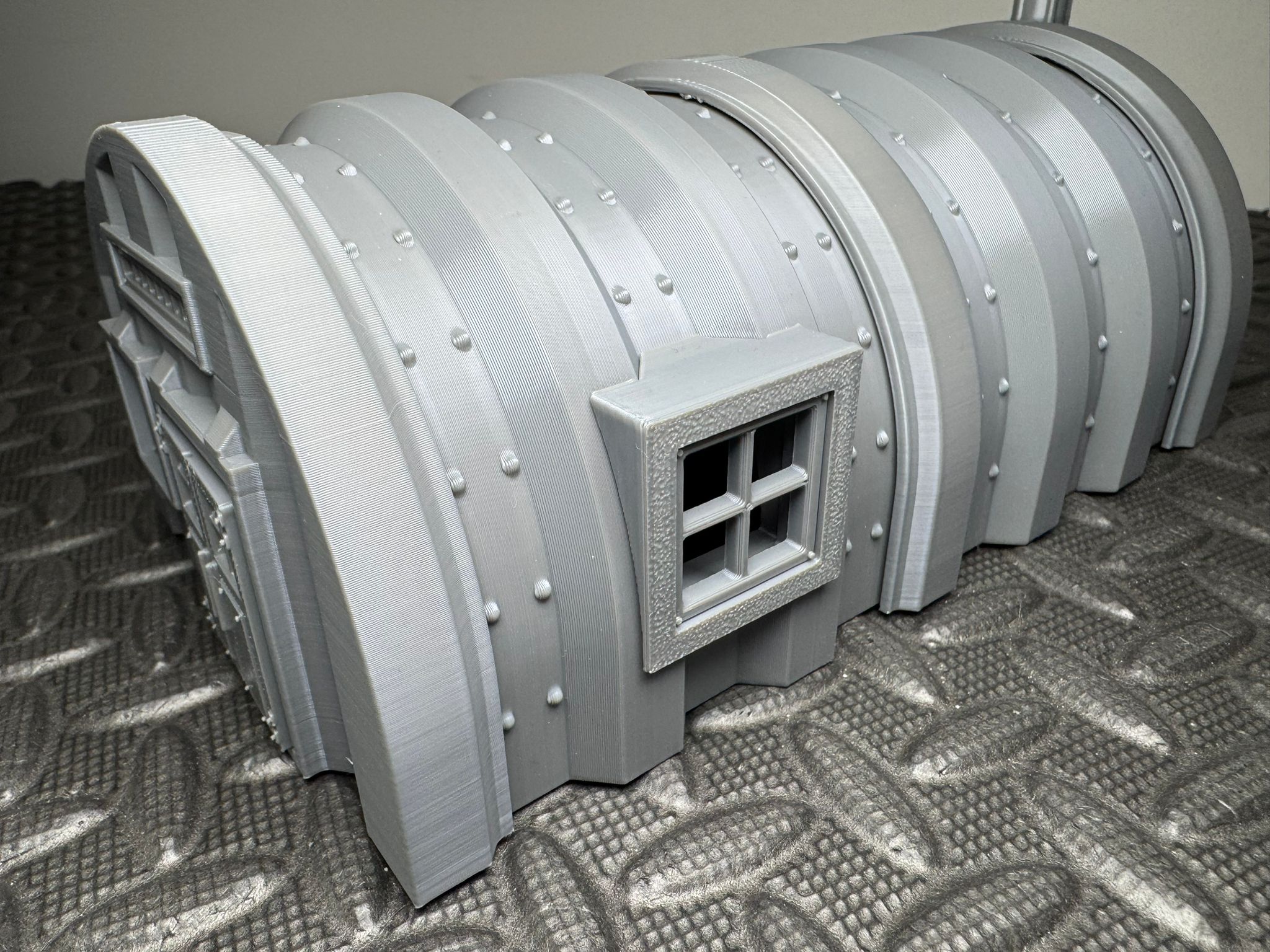 This 3D printed prefab hut is designed with a classic arched structure and detailed panelling, ideal for tabletop gaming or diorama builds. It features separate  sections for easier painting and assembly, along with doors, windows, and a vent for added realism. Suitable for 28mm gaming