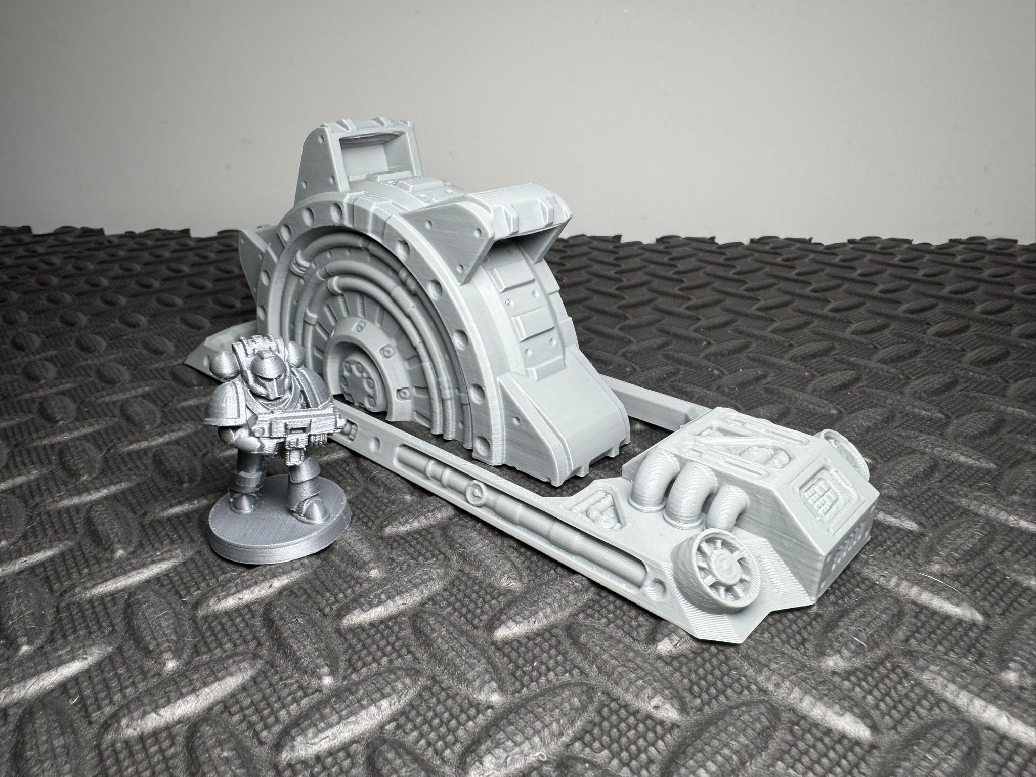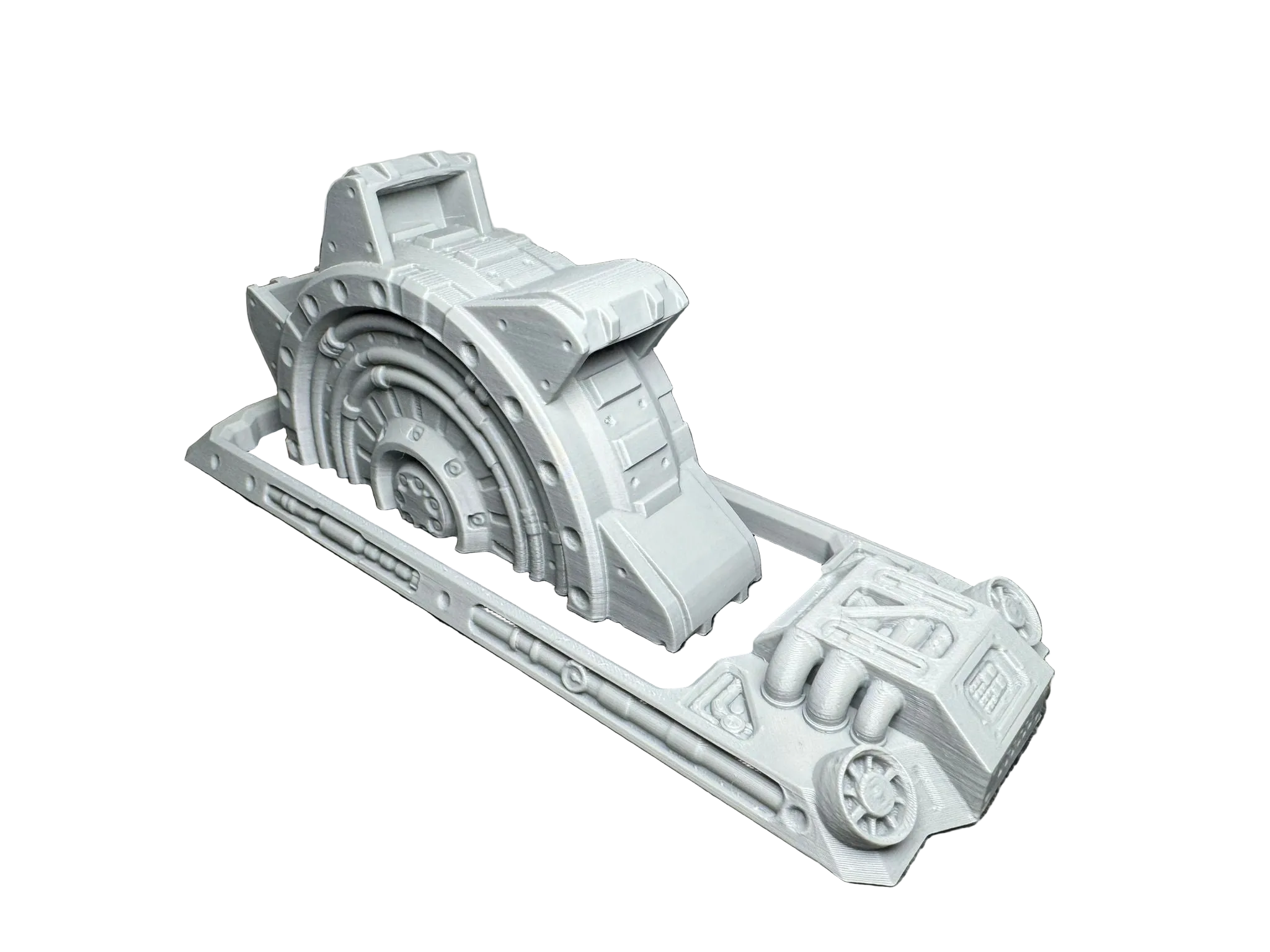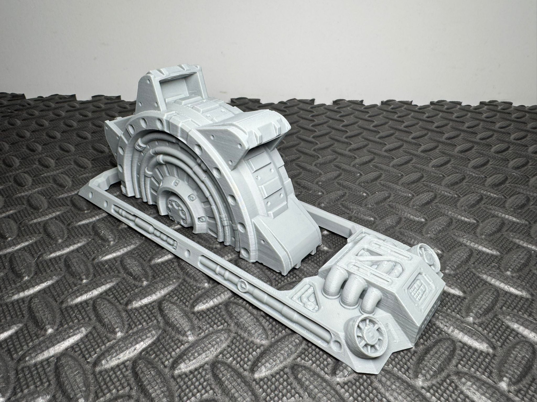 This two-piece sci-fi scatter terrain set features a massive bucket-wheel excavator and support frame, designed to block line of sight in off-world mining and industrial environments.