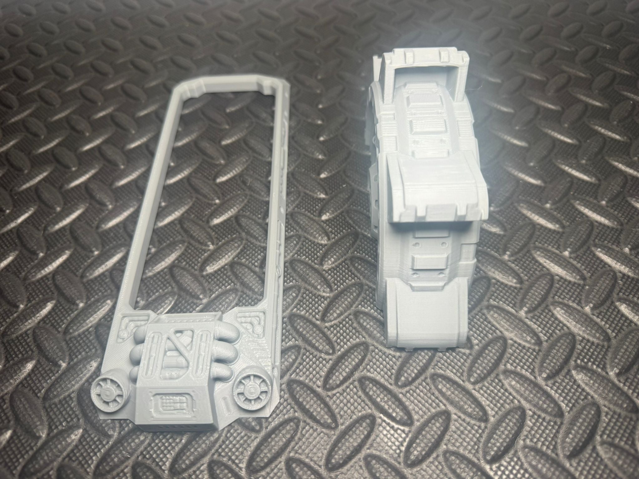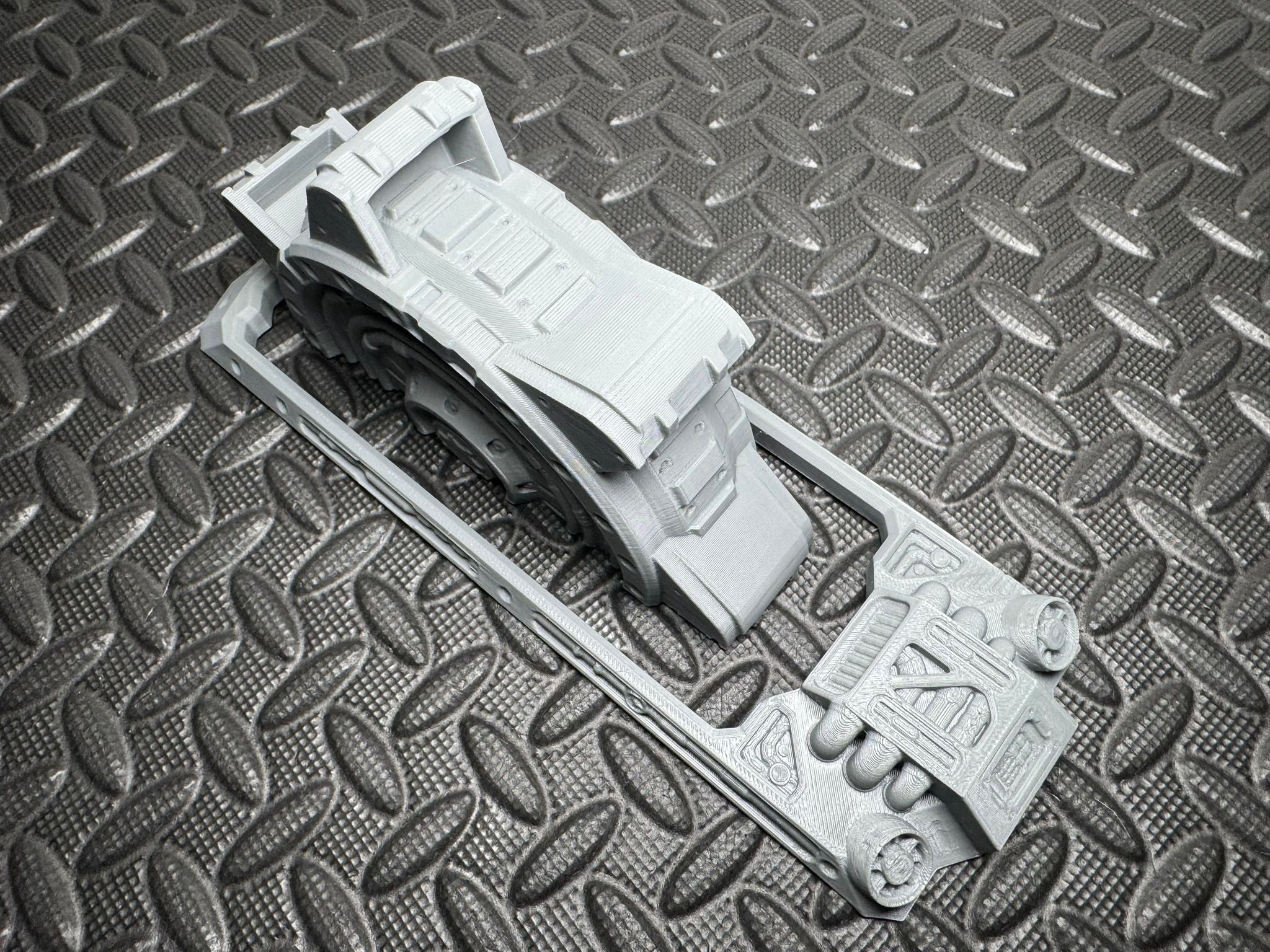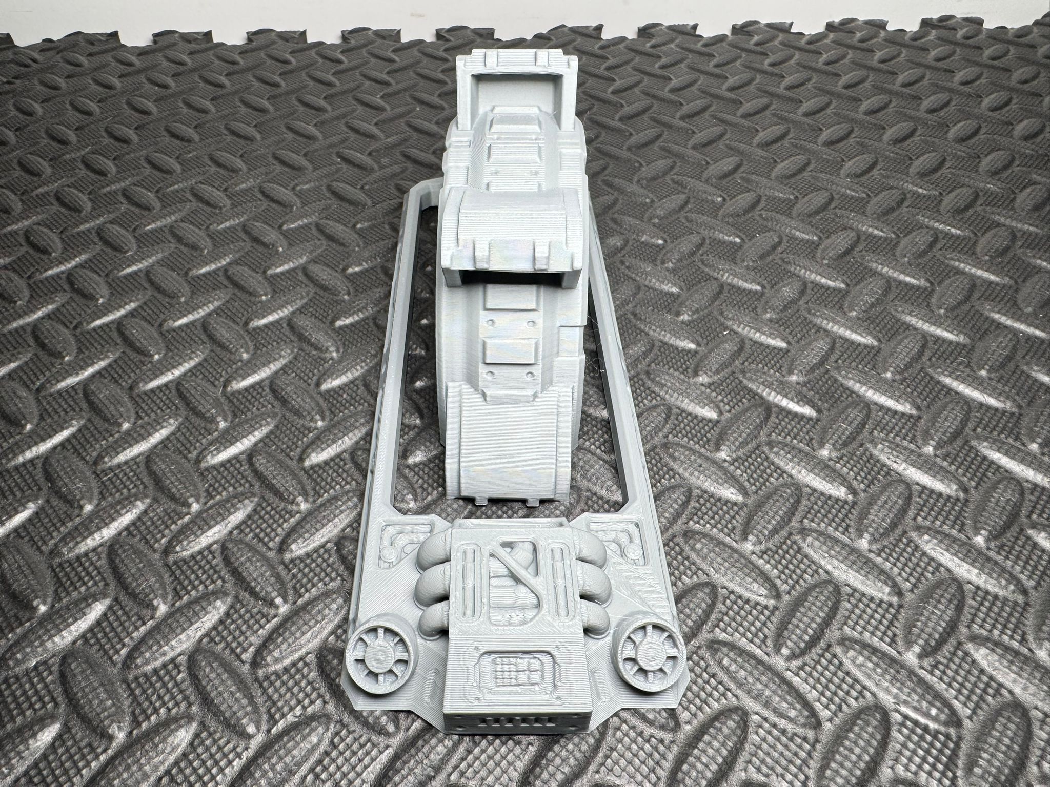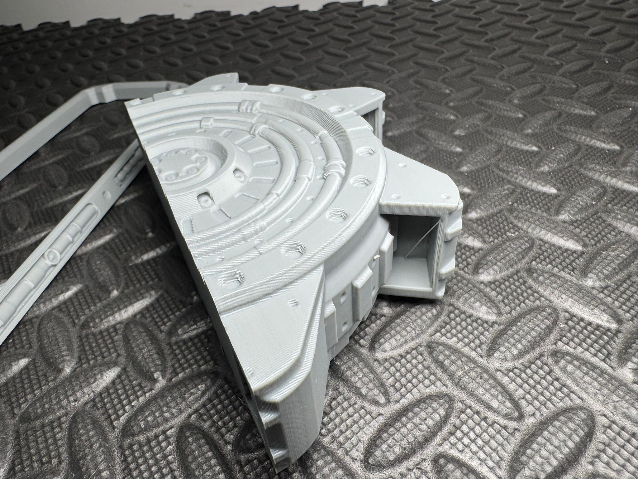 This two-piece sci-fi scatter terrain set features a massive bucket-wheel excavator and support frame, designed to block line of sight in off-world mining and industrial environments.