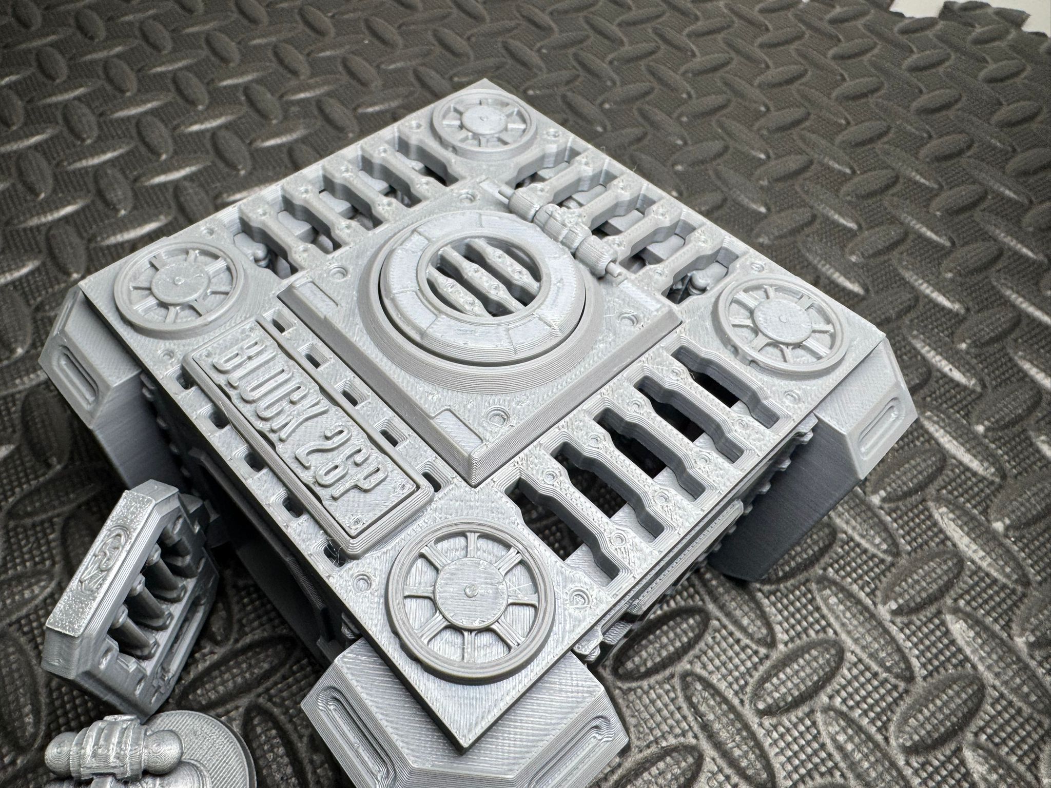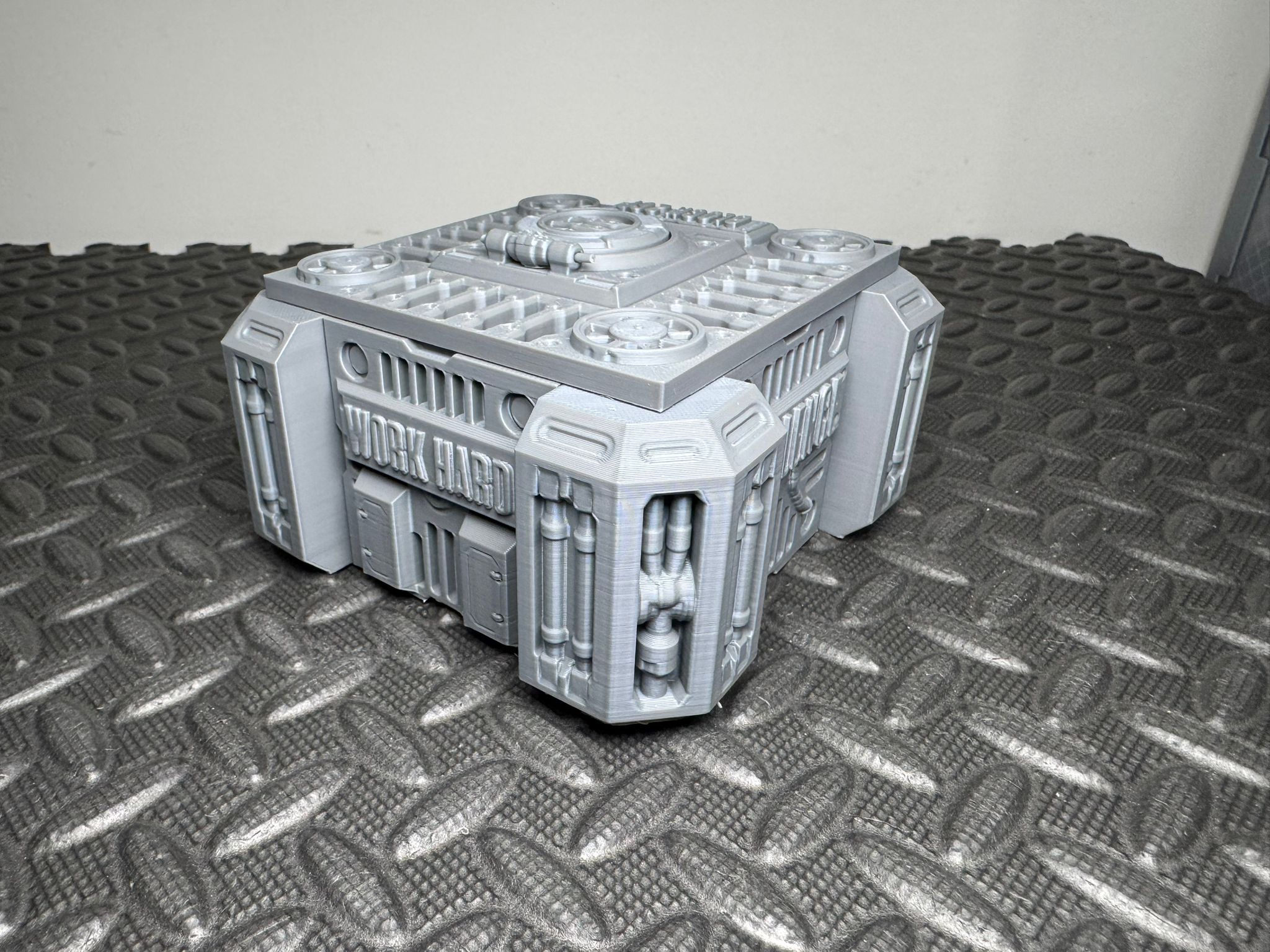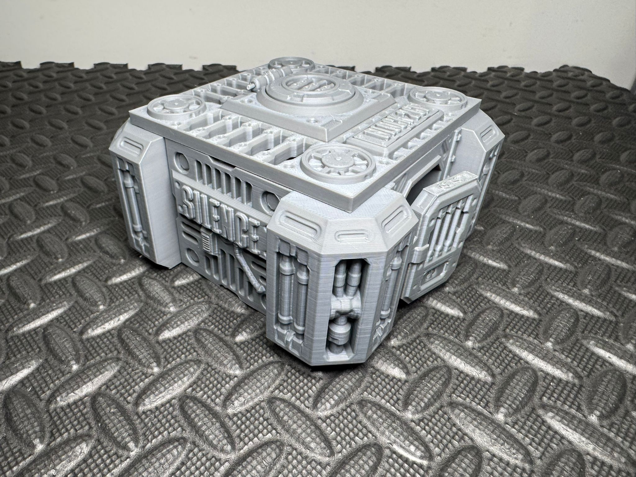 The Modular Sci-Fi Prison Pod is a detailed terrain piece featuring a hinged cell door and roof hatch, both fully movable when connected using the included filament pins.