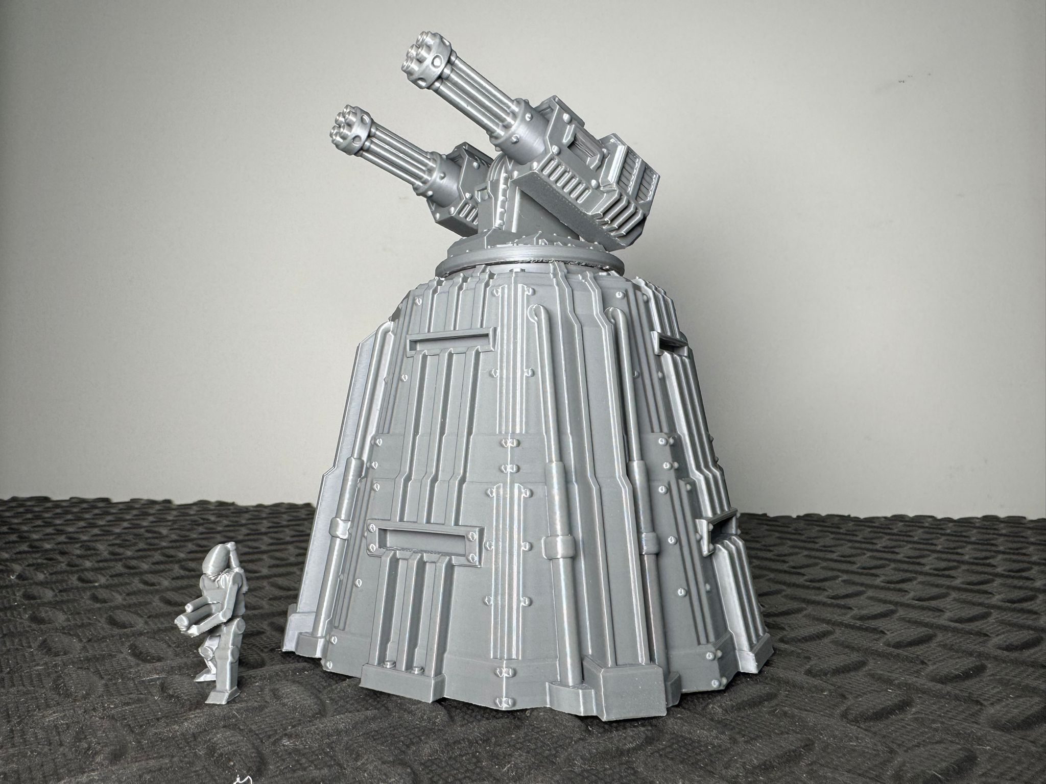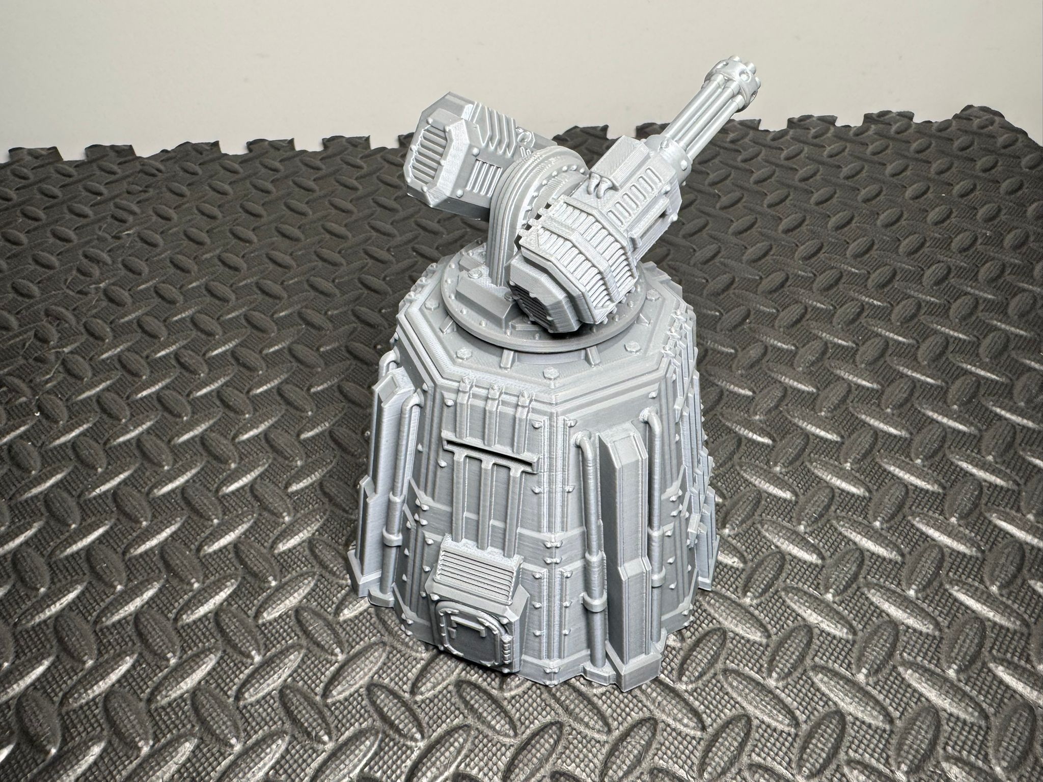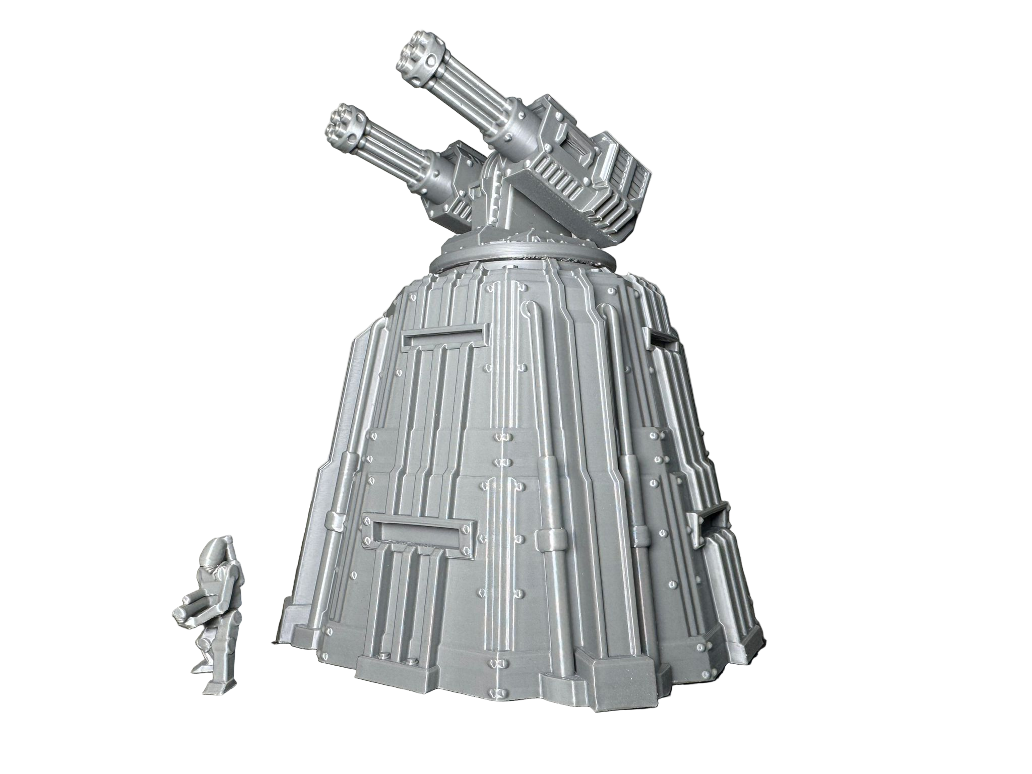 This 5 piece AA Defence Turret from the Zeta Collection is a chunky bit of sci-fi kit that fits straight into any 28mm or 32mm tabletop board. It’s got a solid armoured base and twin rotary guns that look the part on a fortress wall, a defence line or guarding a main objective. Printed in grey PLA and supplied unpainted, it’s an easy upgrade for anyone building a gritty industrial battlefield.
