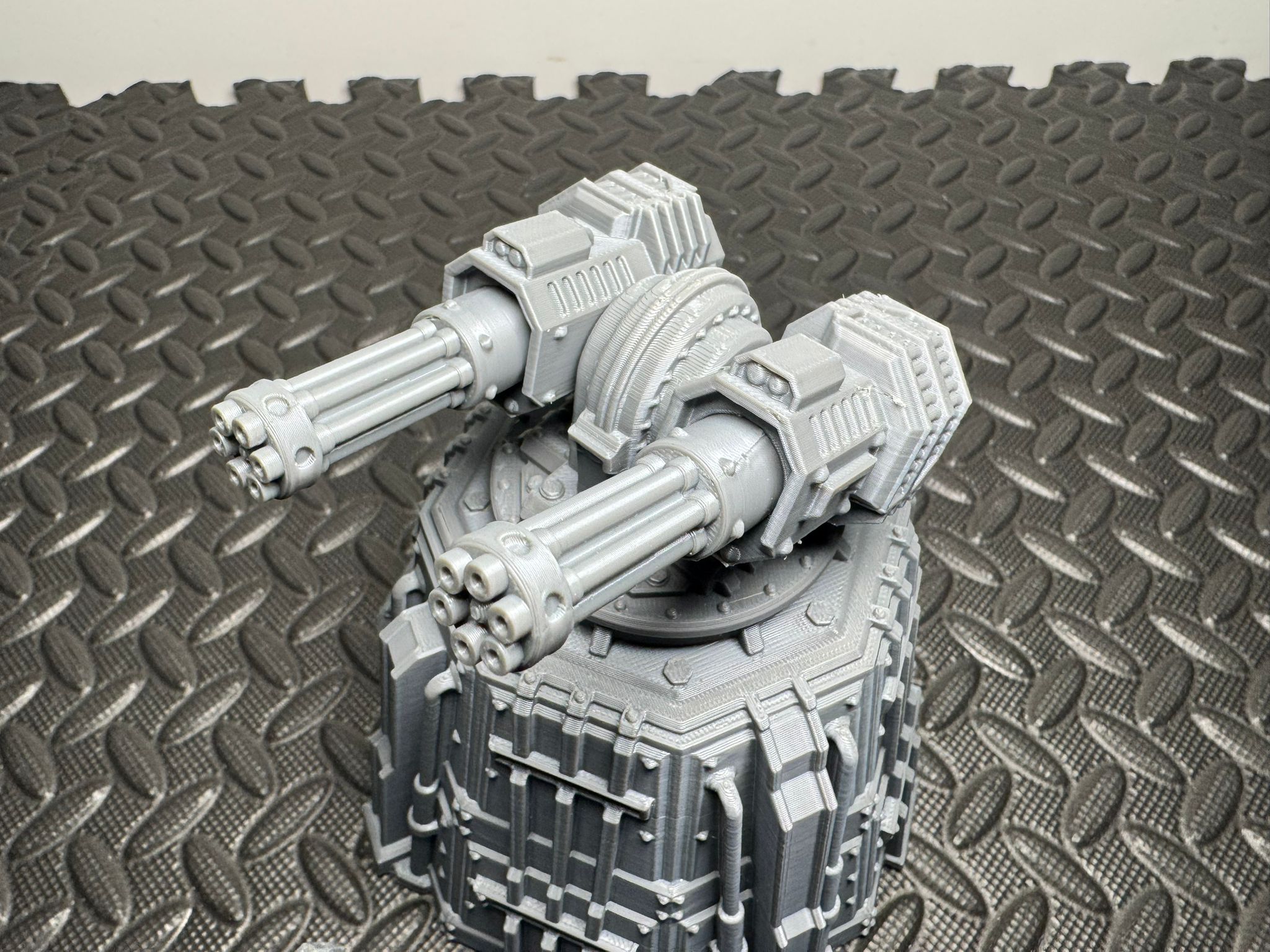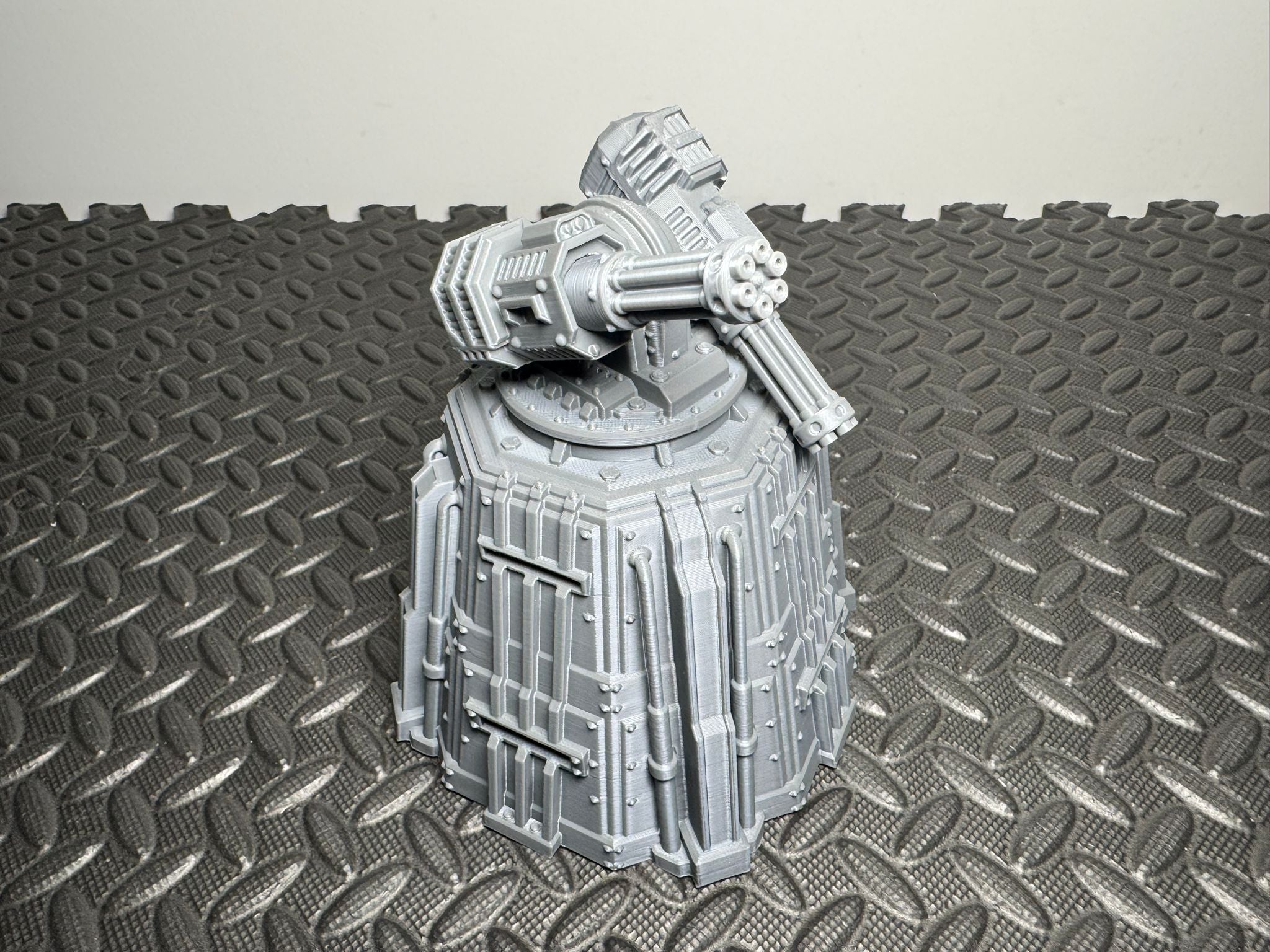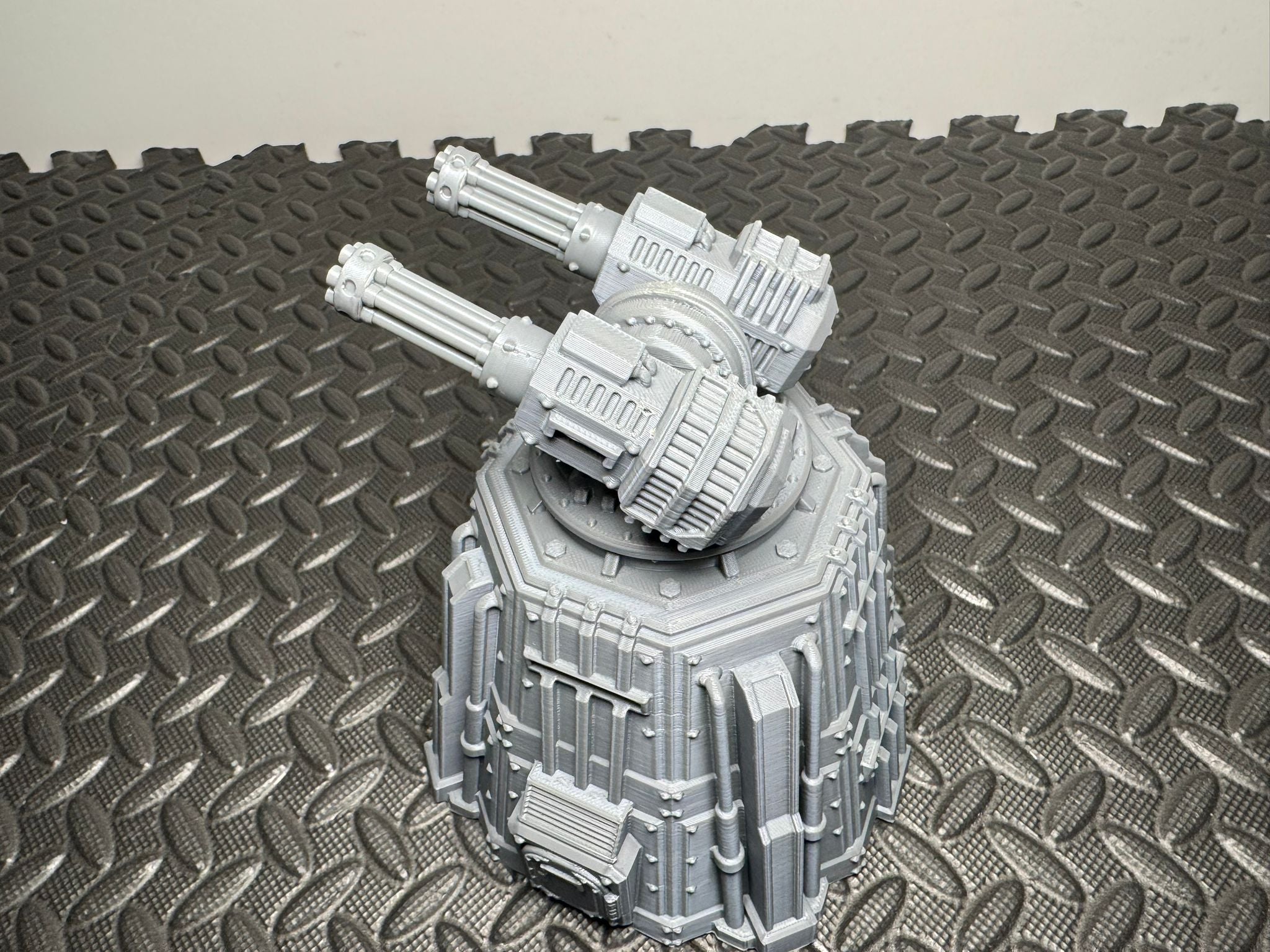 This 5 piece AA Defence Turret from the Zeta Collection is a chunky bit of sci-fi kit that fits straight into any 28mm or 32mm tabletop board. It’s got a solid armoured base and twin rotary guns that look the part on a fortress wall, a defence line or guarding a main objective. Printed in grey PLA and supplied unpainted, it’s an easy upgrade for anyone building a gritty industrial battlefield.