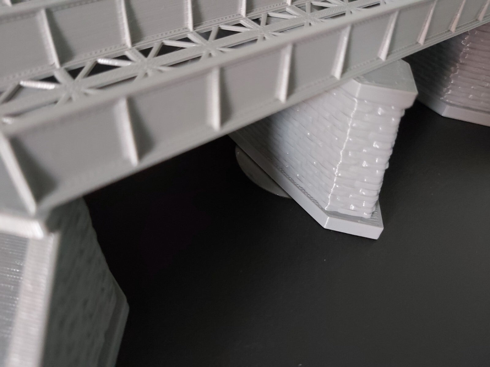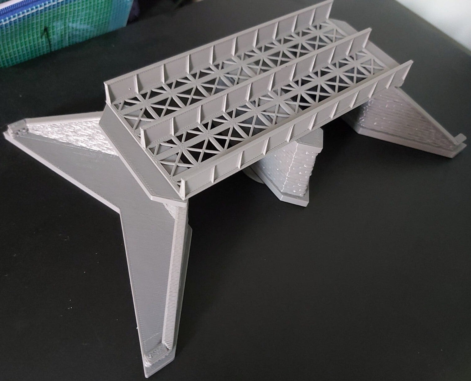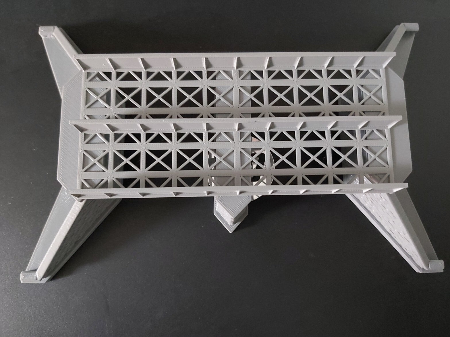 You are looking at a long version with central barrier of our twin track girder bridge for TT120 gauge model railway track with 2 End Pier and 1 Middle Column Piers