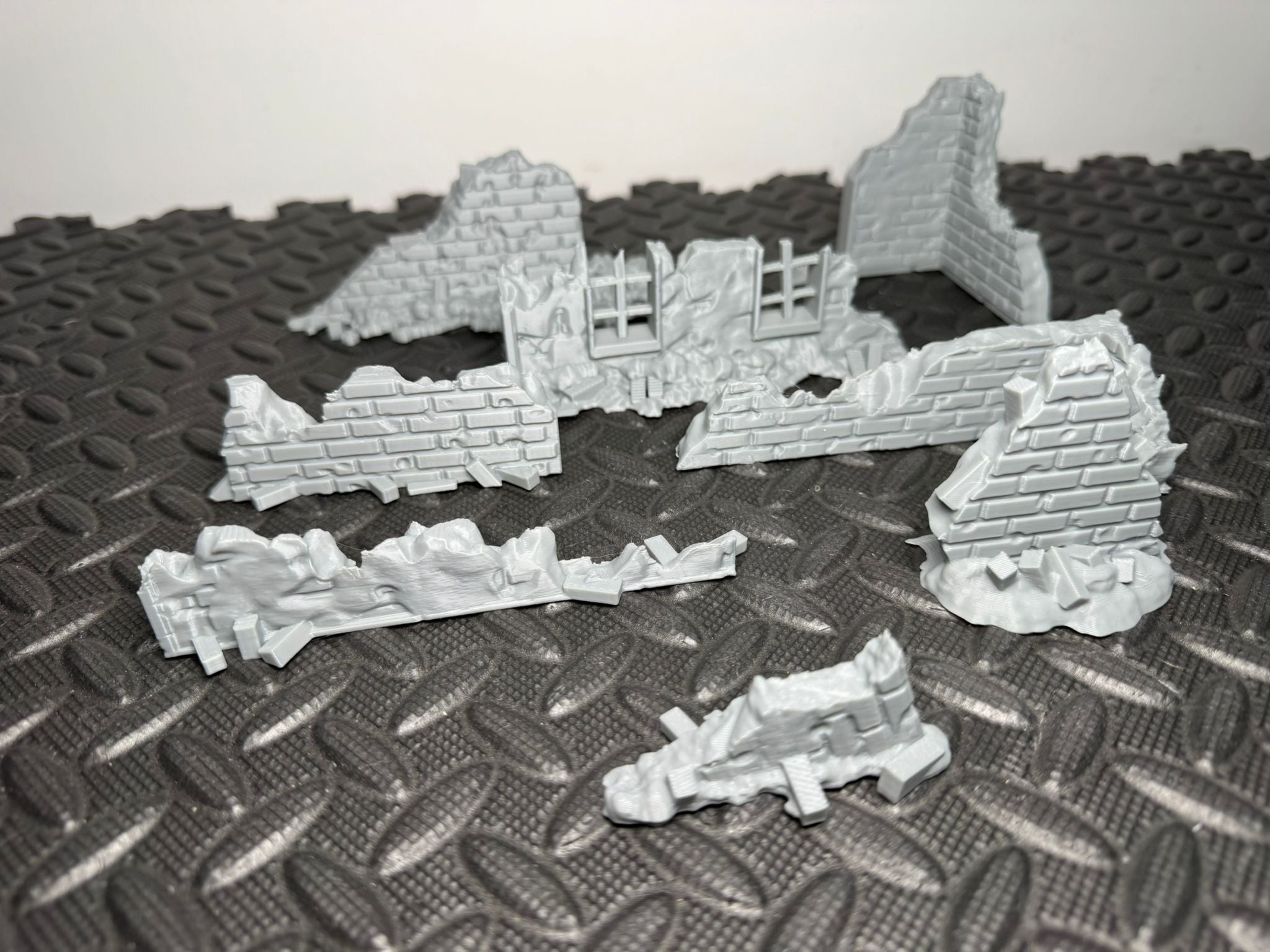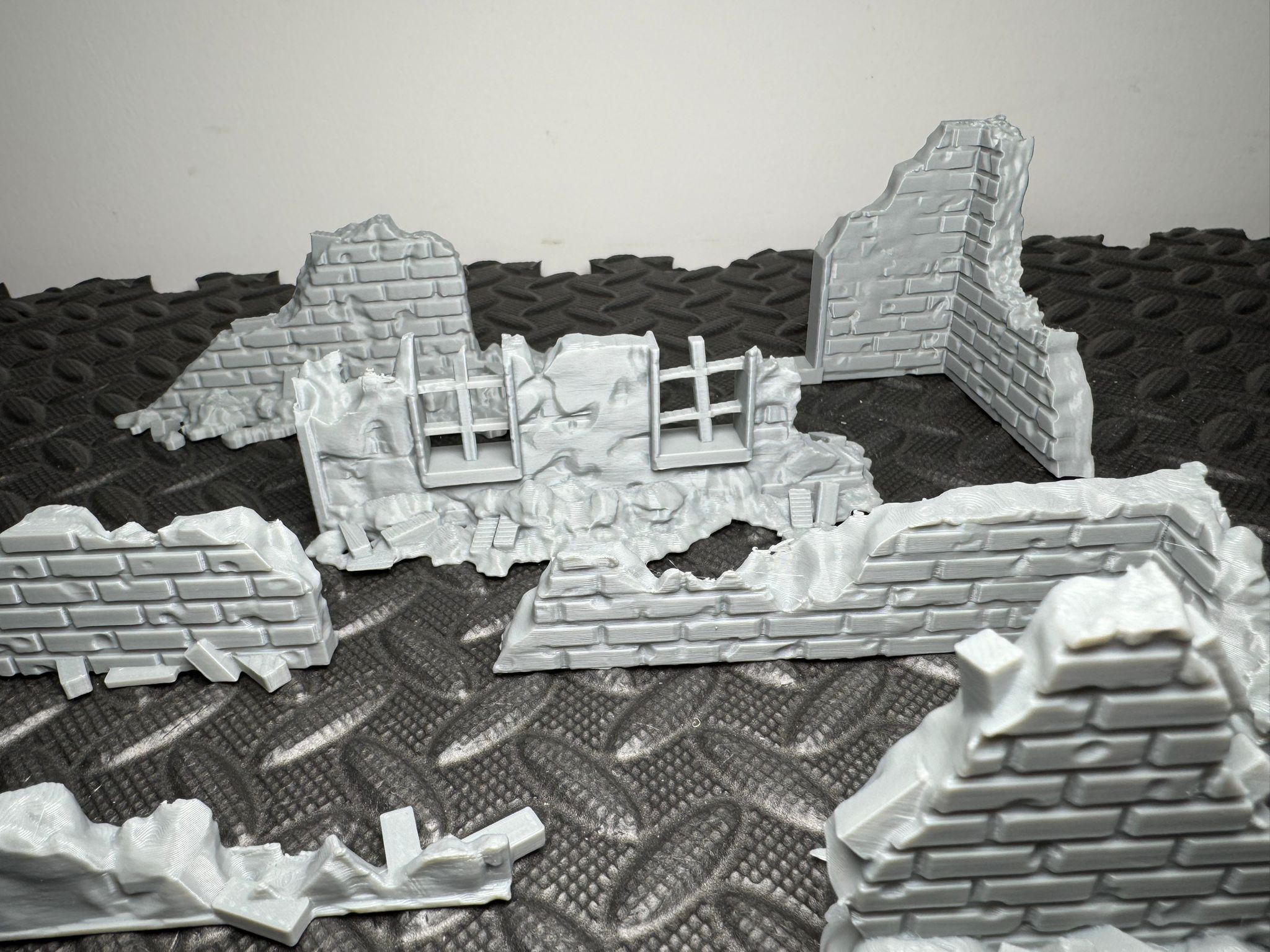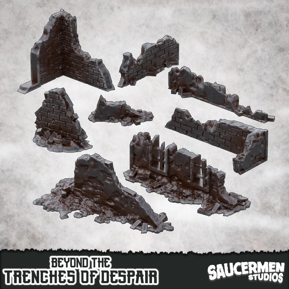Freestanding ruined walls and rubble, perfect for scatter and line-of-sight blocking on your battlefield. Part of the "Beyond the Trenches of Despair" Collection