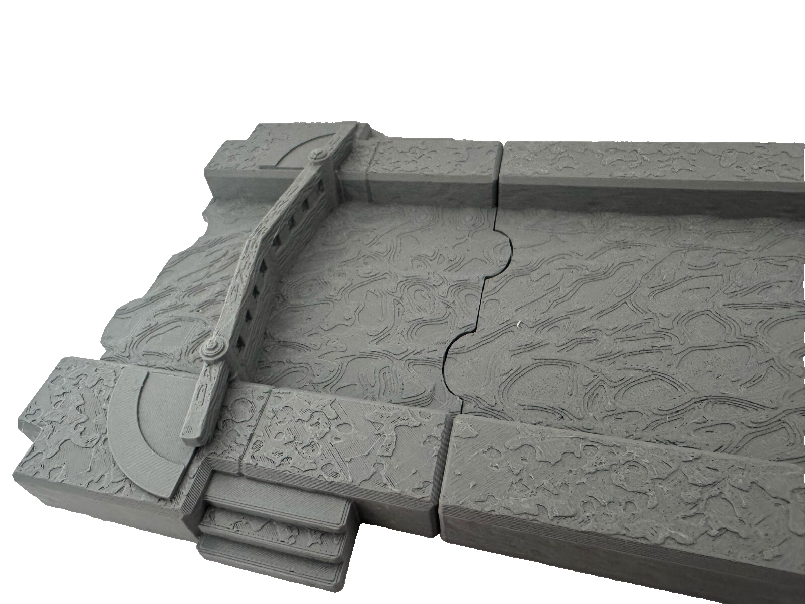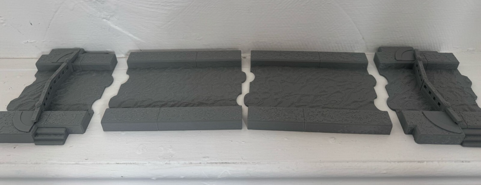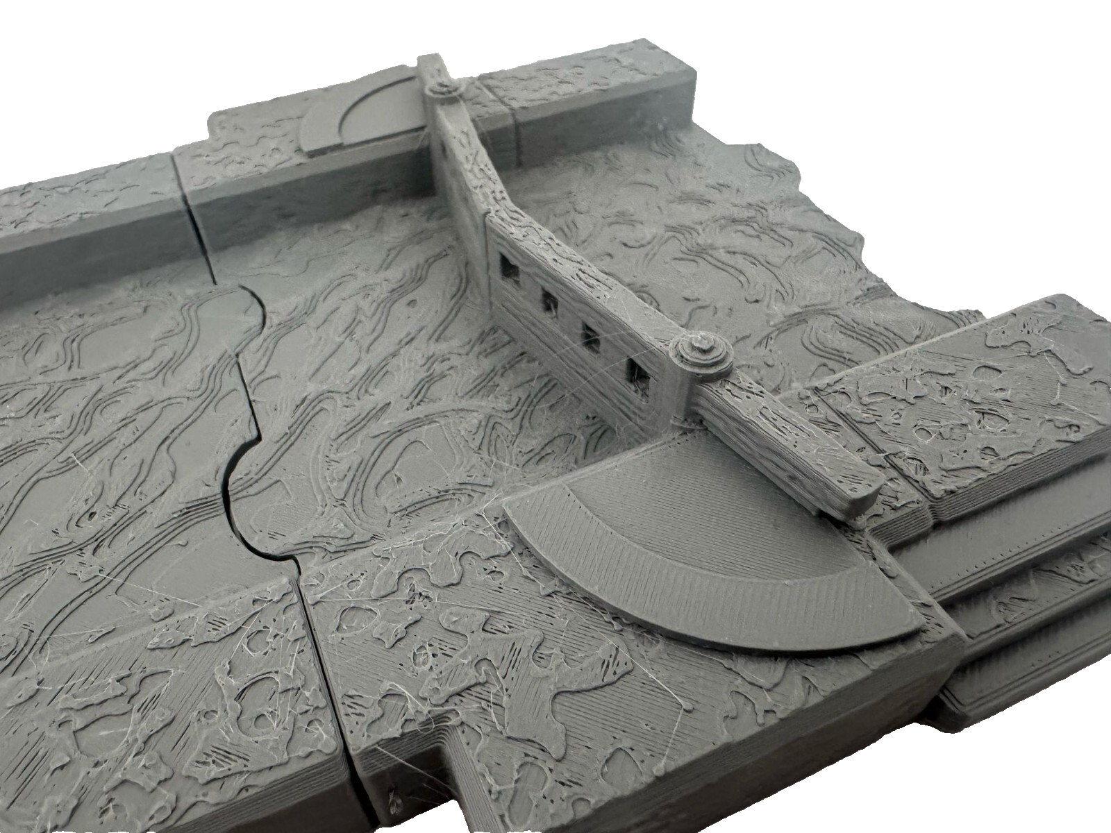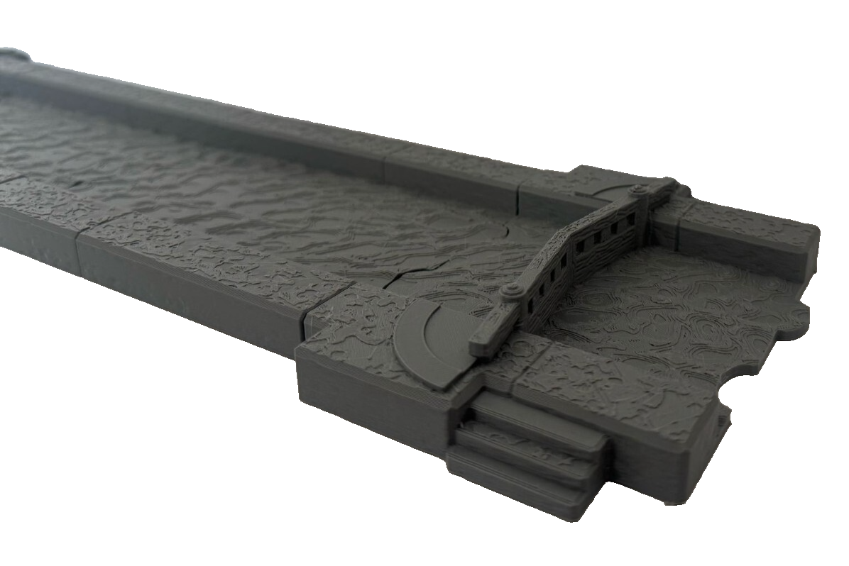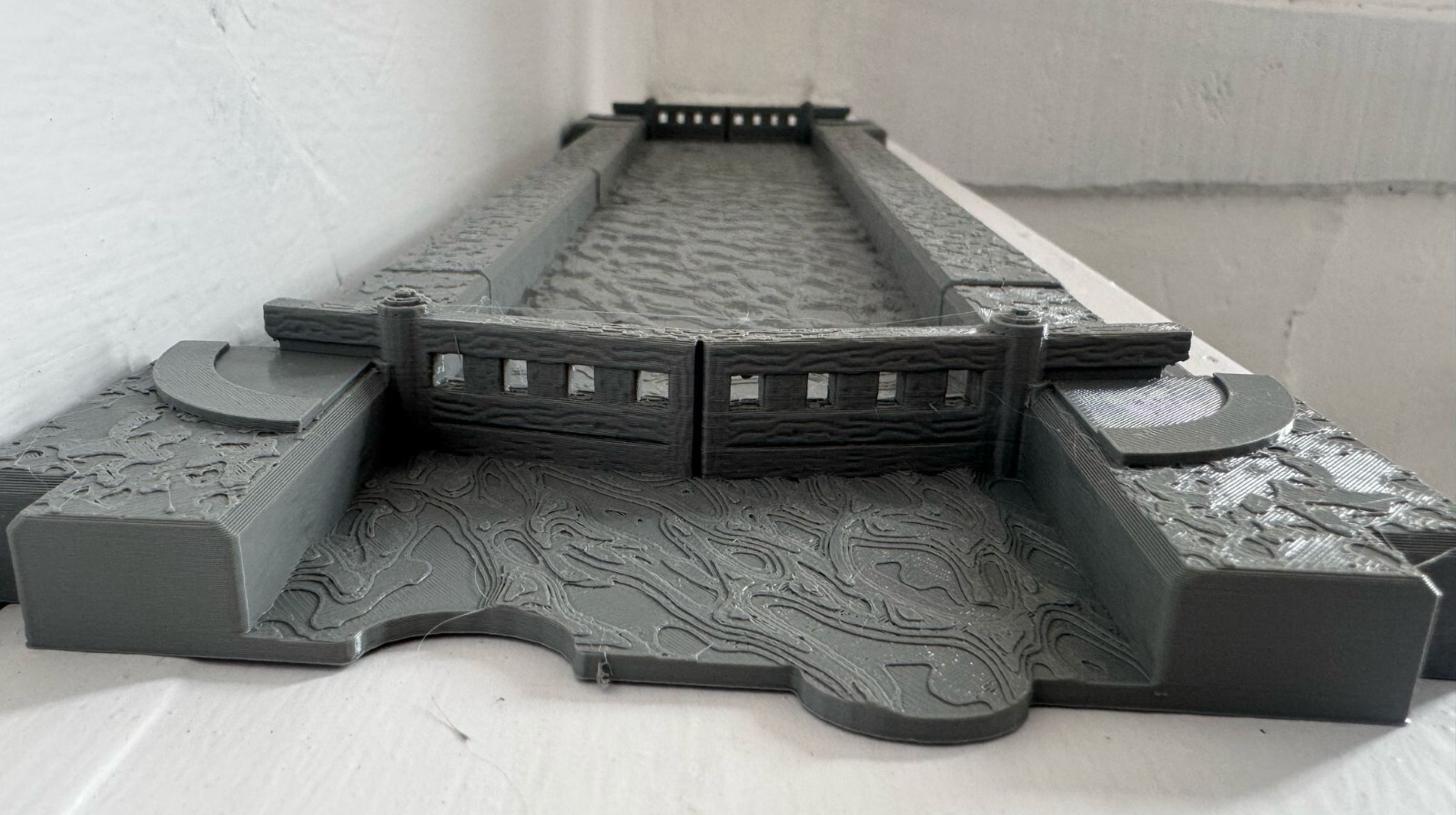 This is a 3d printed 28mm canal style system with fixed lock gates 3d printed in grey.