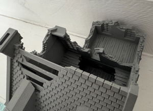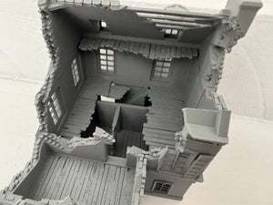 This is a 3d printed ruined townhouse style with porch. Perfect addition to your 28mm Bolt Action game or any other layout for that matter.