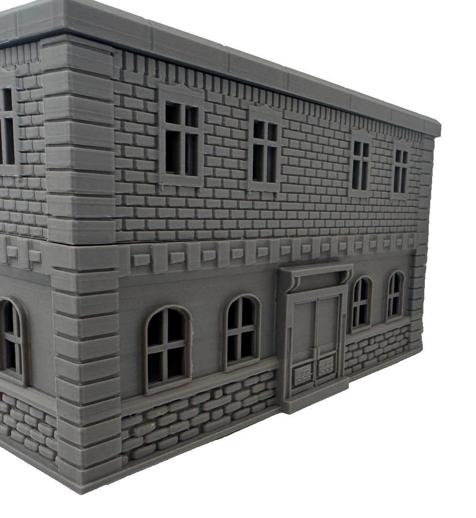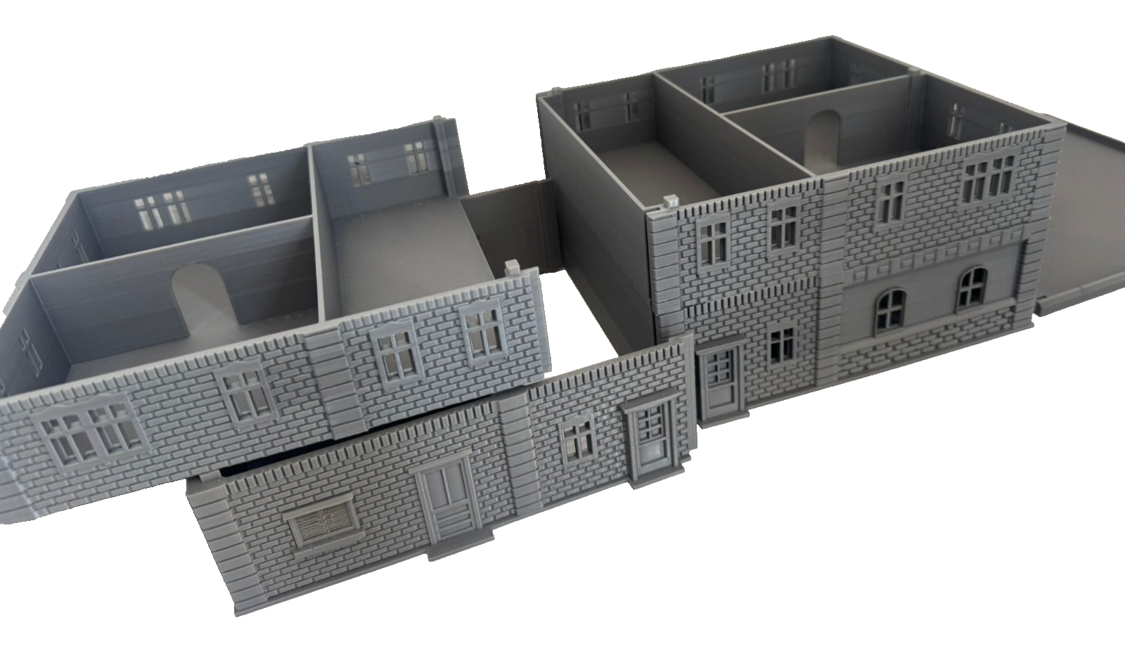 3d Printed in grey PLA, any images you see painted up are just for inspirational purposes, and any figures or other models are not included, you will just receive the building.