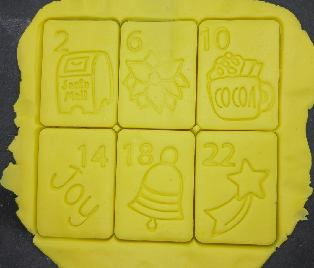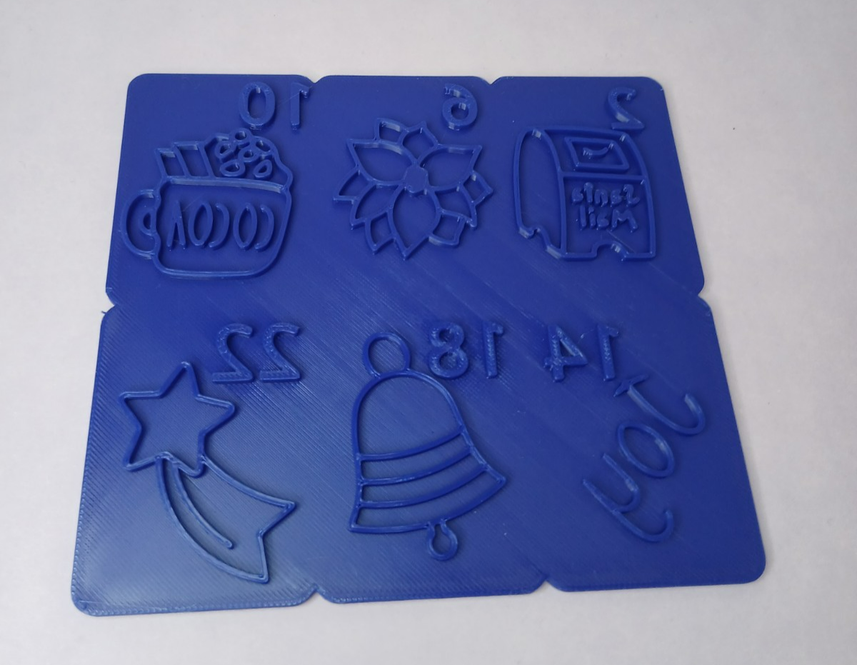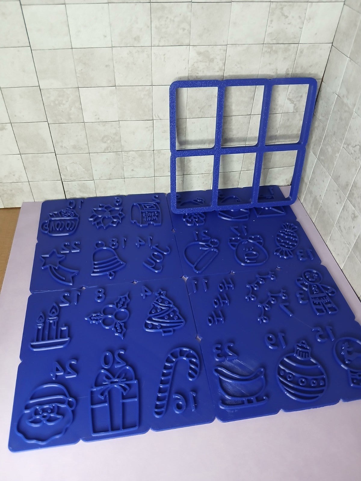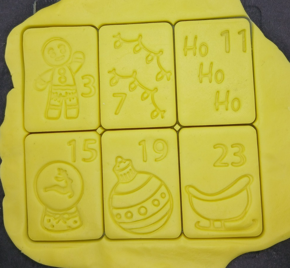 This set of advent calendar cookie cutter and stamps is 3d printed from PLA filament and can be used for any cookie dough to make a lovely little treat for every morning of Advent. It could also be used for icing to add detail to plain rectangular biscuits. The set consists of 5 pieces, one cutter which creates 4 small rectangles and four large cookie stamps which create the images and numbers before you cut them. They work perfectly together and each piece can be used separately as desired. See images and videos for examples of their use with ready to roll icing.