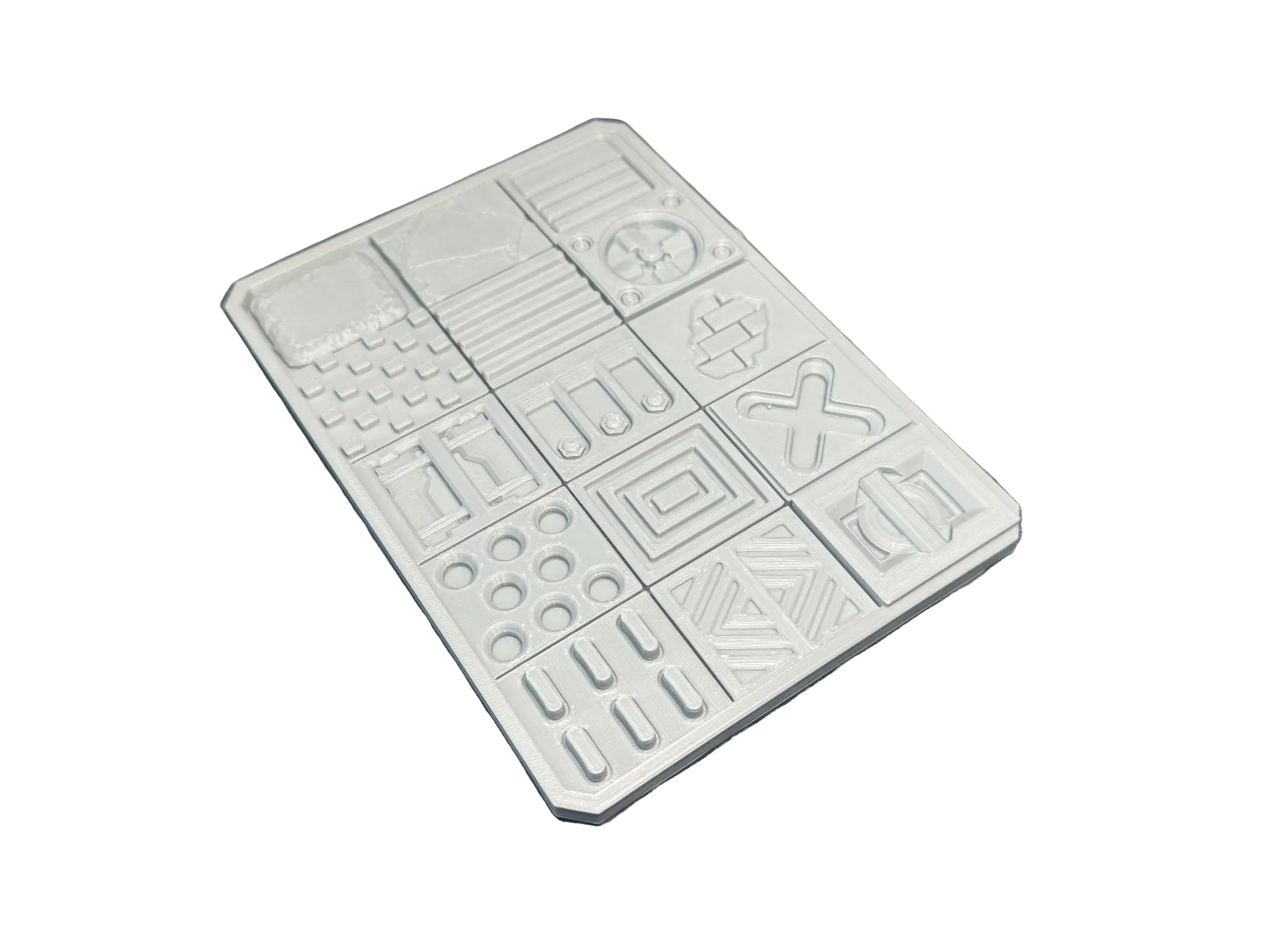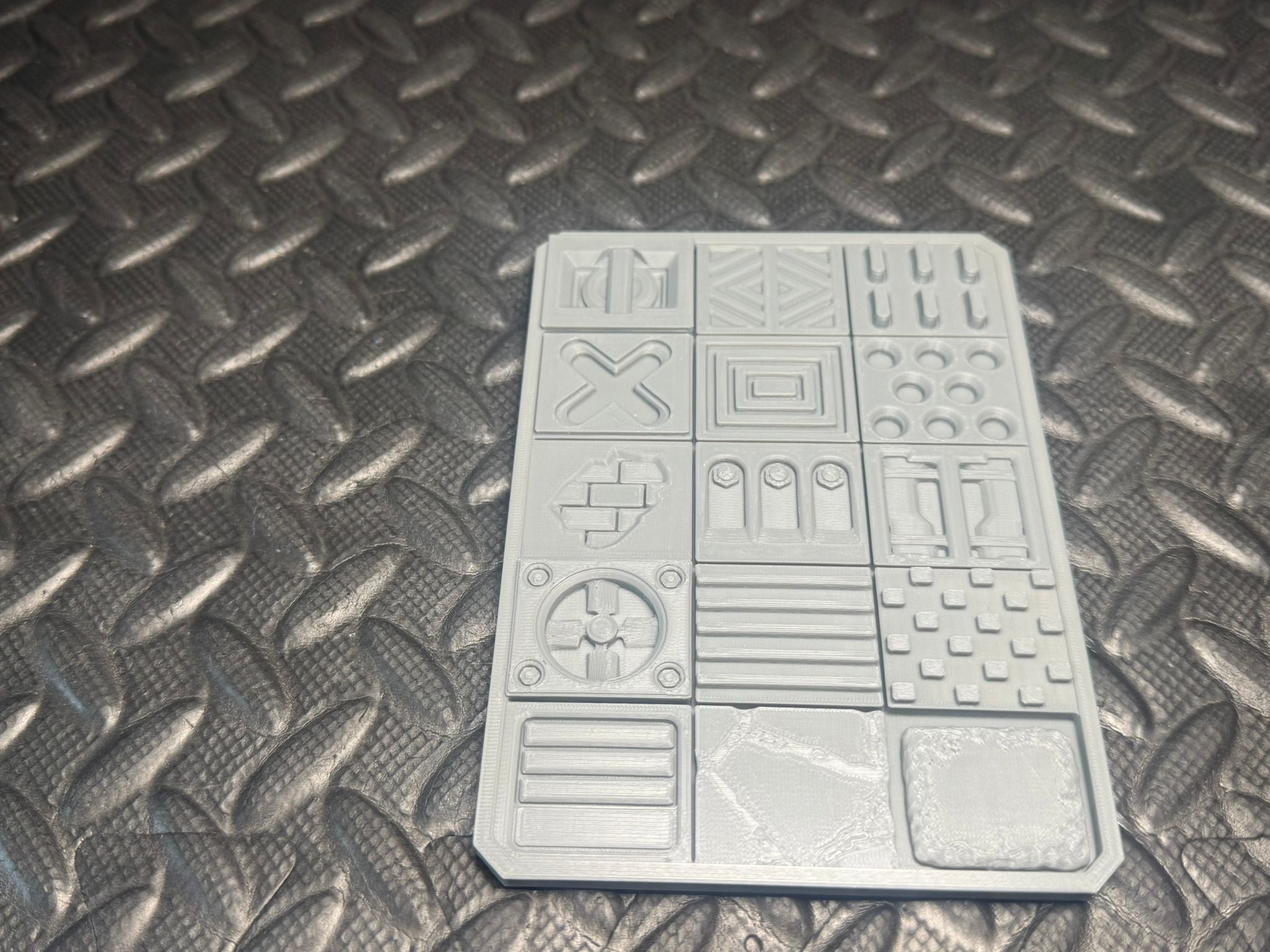 This 10 × 14cm 3D printable Texture & Practice Palette features a range of industrial and sci-fi textures, ideal for testing metallic layers, edge highlights, rust, grime, brickwork, and contrast paints.